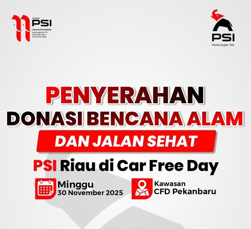 Usai pelaksanaan Rapat Koordinasi Wilayah (Rakorwil) pada Sabtu (29/11/2025), PSI Riau akan menggelar aksi solidaritas kemanusiaan berupa penyerahan donasi dan bantuan untuk para korban bencana alam pada Ahad (30/11/2025) besok.